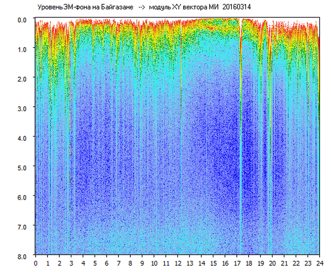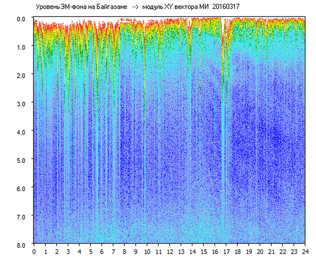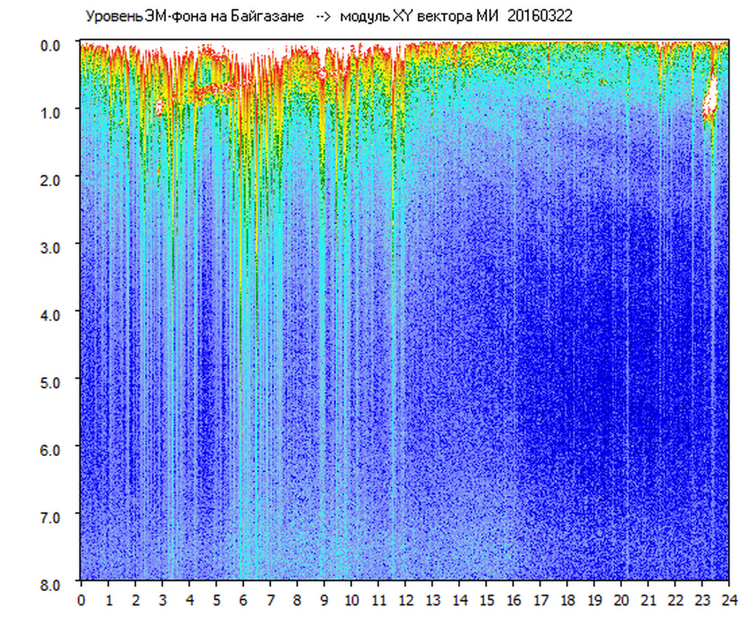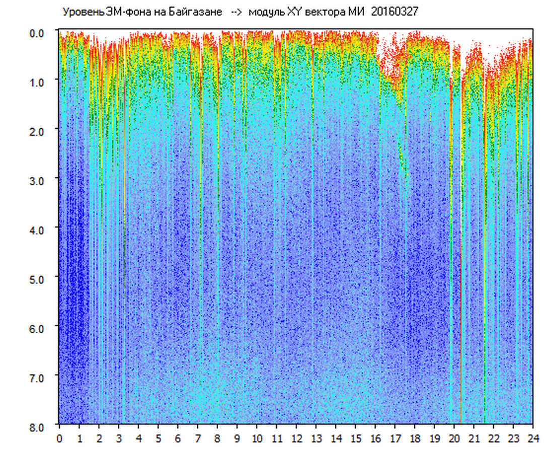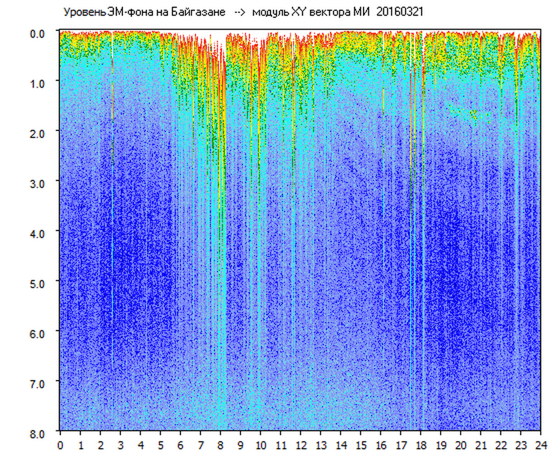 Динамические спектры электромагнитного фона в полосе частот 0 – 8 Гц (Альфвеновские резонансы)