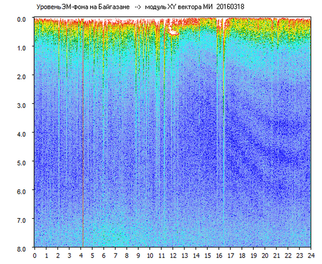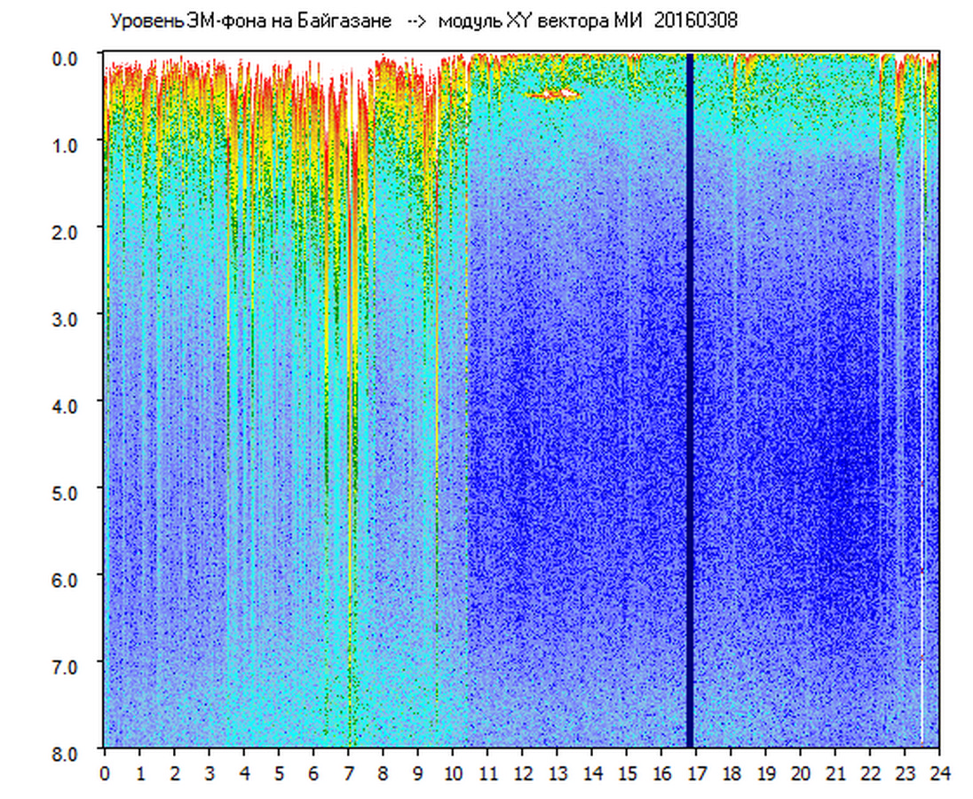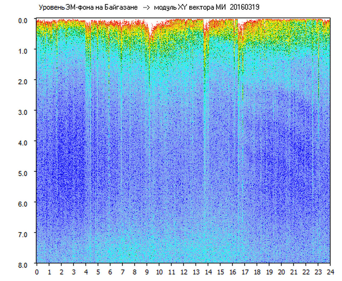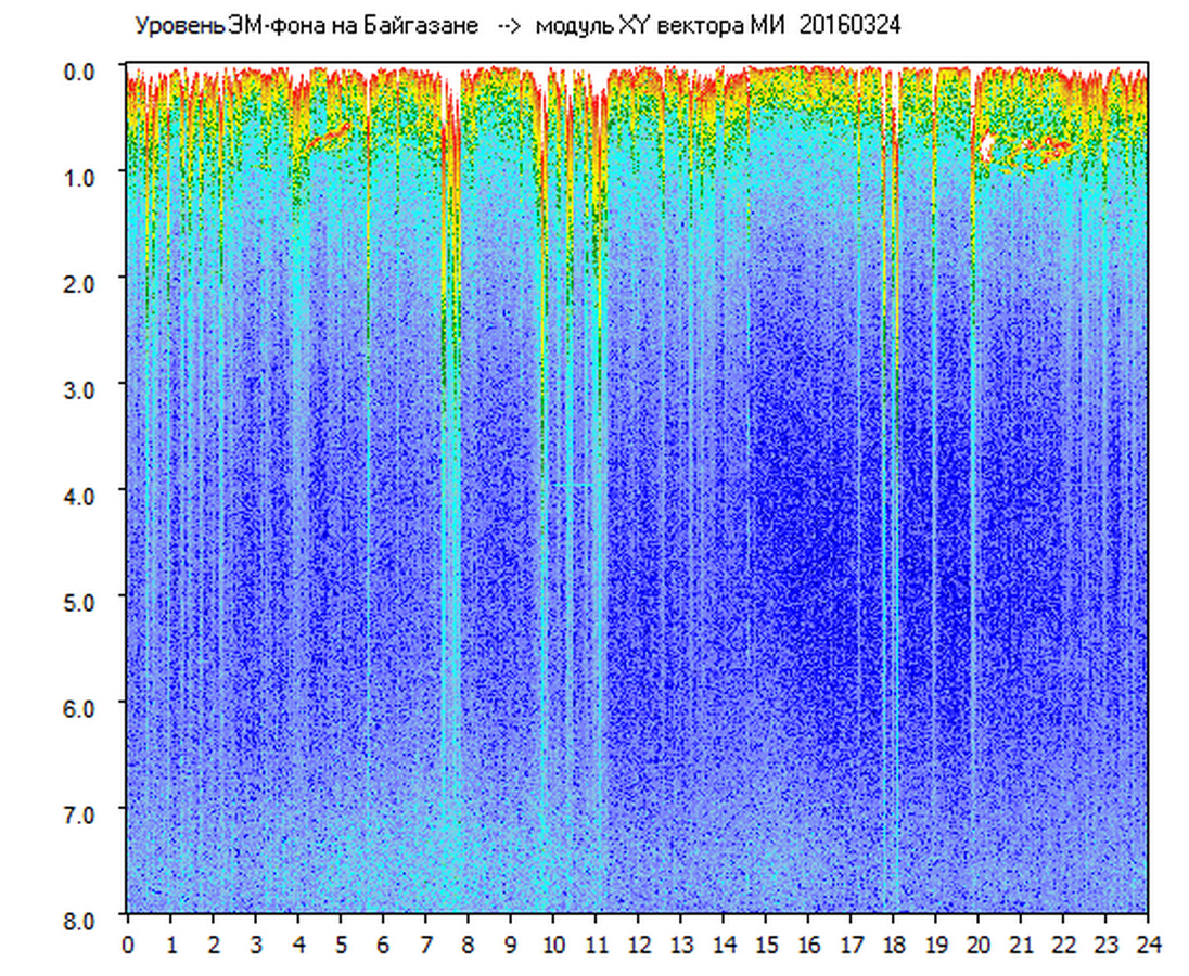 Динамические спектры электромагнитного фона в полосе частот 0 – 8 Гц (Альфвеновские резонансы)